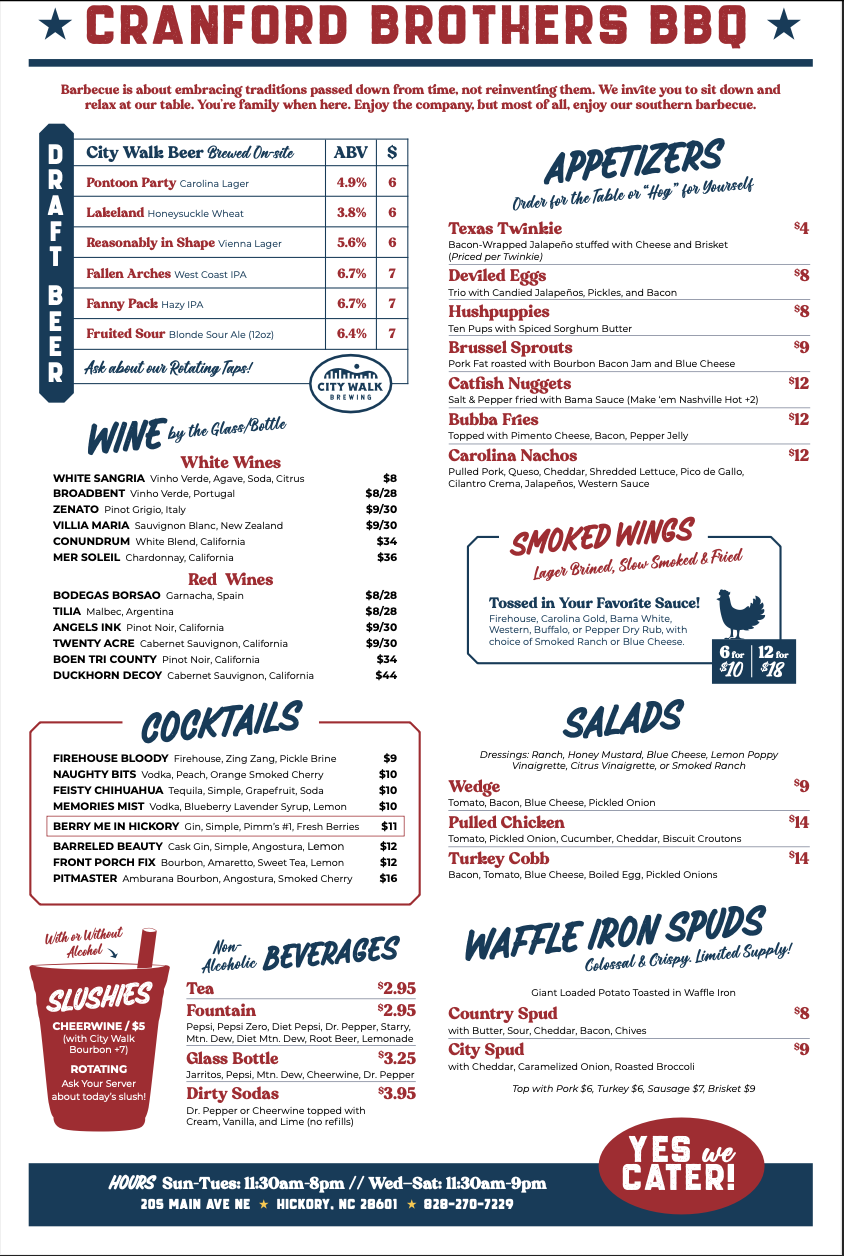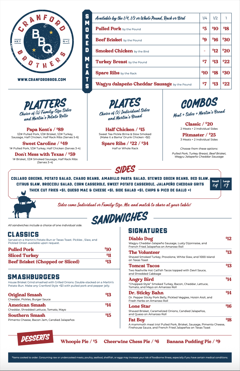House Brisket Grind smashed with Grilled Onions, Double-stacked on a Martin's Potato Bun. Make any Cranford Style +3 with pulled pork and pepper jelly.